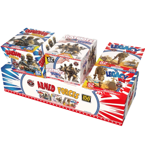 Armed Forces 1500g 3-Cake Compound Finale – 156 Shot Silver Nishiki & Blue Deploy the ultimate tribute with Armed Forces! This 1500g 3-piece compound set features 156 shots of professional-grade silver nishiki willows and bright sapphire blue stars. Pre-fused for a seamless, high-intensity grand finale. Maximum sky saturation and high-contrast metallic effects for 2026.