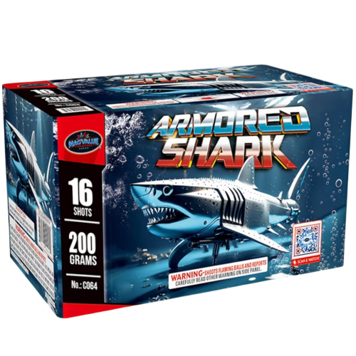 "ARMORED SHARK": 16 shots of wide-angle V-shaped power! Featuring the famous Nishiki willow effect for a long-lasting golden hang-time. With a vibrant tri-color accent of blue, purple, and orange, this 200-gram beast offers a professional look with a predatory edge. Take a bite out of the night!