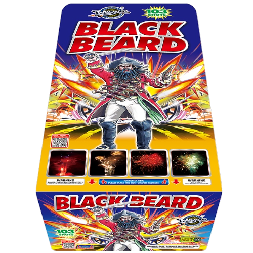 Black Beard 103-Shot 500g Z-Cake – Whistling & Gold Silk Willow Command the horizon with Black Beard! This 103-shot 500g Z-shaped fan cake features a rapid-fire multi-effect display. Highlights include silver whistling tails, gold silk willows with red/blue pearls, and vibrant palm tails to strobe. A high-velocity, horizon-filling performance with a massive 103-shot finale. The ultimate choice for a professional-grade, sweeping aerial show.