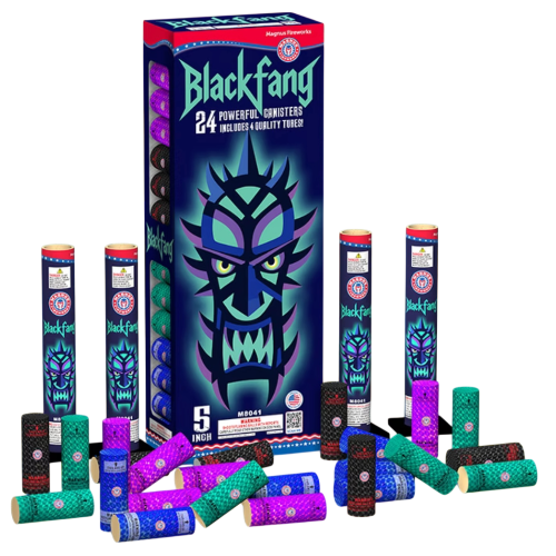"BLACKFANG": 24 shots of 5-inch canister dominance! This master kit features four unique effect profiles, including Nishiki-style willows, crackling chrysanthemums, and unique fish effects. With a massive color palette and four separate boxes for easy show planning, Blackfang is the ultimate artillery solution for a 5-star backyard finale.