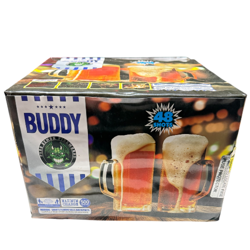 "Buddy": 500 grams of pure backyard fun! This beer-themed beauty features a crisp time rain opening with purple and lemon highlights, followed by majestic gold palms. The show-stopper is the gold wave crackling willow with a green strobe accent. Perfectly chilled and ready to blast!