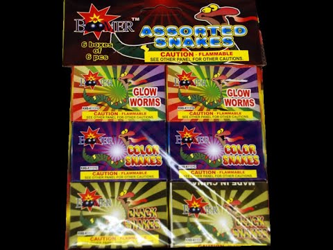 6 PACK = A new version of a real fireworks classic. Each pack contains six boxes with six snakes in each box. Assortment includes two boxes of black snakes, two boxes of glow worms, and two boxes of colored snakes. This family favorite offers some of the best colored snakes on the market and include; green, yellow, orange and red snake versions. Comes complete with a cardboard header which helps with the ease of displaying this item.