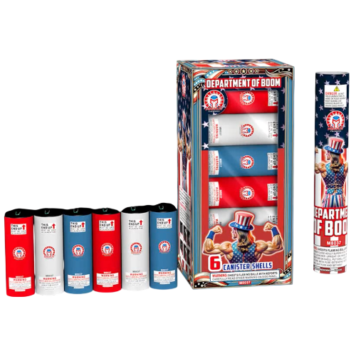 "DEPARTMENT OF BOOM": 6 shots of 5-inch canister power! Featuring a high-velocity whistle to willow transition with strobes and chrysanthemums. Drenched in a 5-color neon spectrum (Red, Green, Orange, Purple, and White). When the Department speaks, everyone listens. Bigger shells, louder booms!