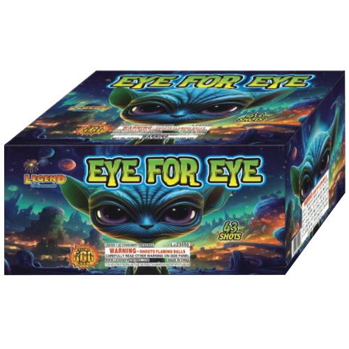 "Eye for Eye": 500 grams of pure force! Red, white, and gold tails, comets, willows, mines, strobes, and crackle. A powerful display!