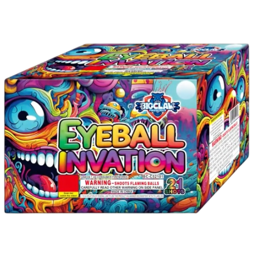 Eyeball Invasion 21-Shot 500g Cake – V-Shape & Fan Specialist Invade the sky with Eyeball Invasion! This 21-shot 500g cake features multi-angle V-shape and Fan-shape volleys. Effects include gold palms, red tiger tails, and blue dahlia with ghost red.