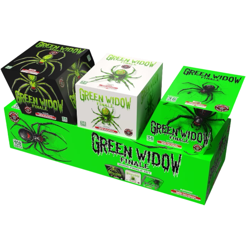 Green Widow 1500g 3-Cake Compound Finale – 108 Shot Fan Effect Dominate the horizon with the Green Widow! This 1500g 3-piece compound finale features 108 high-caliber shots in an intense fan-shaped display. Massive gold spider effects with piercing neon green stars. Professional-grade wide-format sky coverage. Pre-fused for a seamless, high-intensity grand finale for 2026.