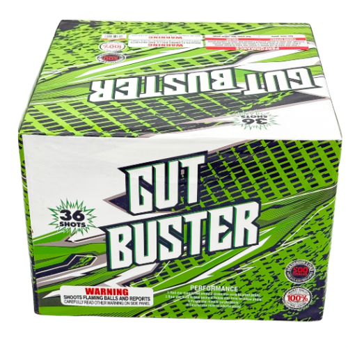 "Gut Buster": 500 grams of neon force! Mines launch massive peonies and pearls in electrifying red, green, blue, orange, and pink. Prepare for impact!
