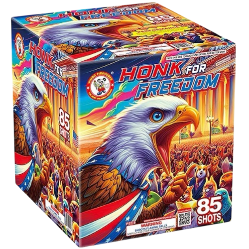 Honk For Freedom 85-Shot 500g Cake – Patriotic Gold Willow & Strobe Celebrate liberty with Honk For Freedom! This 85-shot 500g barrage cake features blue to red strobes and brocade tails to gold willows. High-cadence performance and professional-grade patriotic sky saturation. The ultimate rapid-fire finale cake for the 4th of July 2026.
