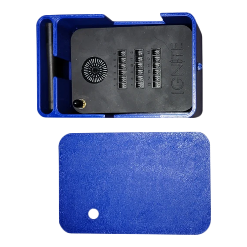 Finally, a case designed specifically for the i18 IGNITE unit! With this case, you don’t need to buy anything extra! There is a spot specifically designed to hold the antenna when not in use, and when the antenna is in use, it now holds the rubber antenna nub! Plus, there are slots on each side of the case with plenty or space to route all the ignitors or breakout cables you are using, and still you are able to snap the cover shut.Open the cover, screw on the antenna, plug in all your cables or ignitors and slide the cover over the antenna and snap it closed! It weighs less than half a pound, comes in a wonderful blue color and has GLMR printed on the bottom as you can see. It’s made out of PETG+ and we heat tested it up to 165 degrees before it got pliable.