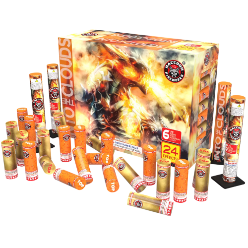 Into The Clouds 24-Pack 6" Artillery Shells – Specialty Multi-Effect Kit Go higher with Into The Clouds! This 24-shell kit features 6-inch XL canisters in four unique sets: Tiger Tails, Mines-to-Breaks, Double Breaks, and Nishiki with Rings. Effects include plum blossom, coconut, brocade, and willow. Full 6-color palette.