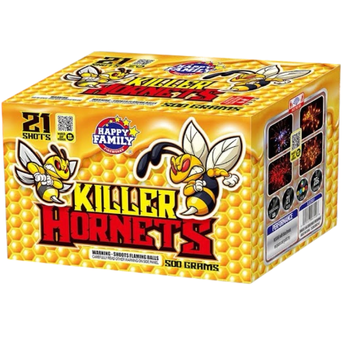 Killer Hornets 21-Shot 500g Firework Cake – Willows & Purple/Yellow Pearls Unleash the swarm with Killer Hornets! This 21-shot 500g aerial cake features massive golden willows with purple, yellow, and red strobe accents. Concludes with a high-impact 4-shot finale featuring "Crackle Tip" willows. A professional-grade 500-gram display with unique neon colors and a loud, buzzing finish.