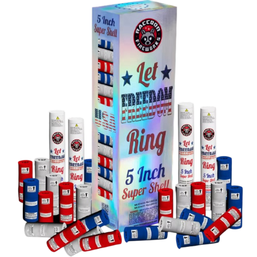 Let Freedom Ring 24-Pack 5" Artillery Shells – Red, White & Blue Specialist Celebrate with pride! Let Freedom Ring is a 24-shell kit featuring 5-inch XL canisters in a dedicated red, white, and blue palette. Effects include peony, brocade, crackle, strobe, palm, willow, and chrysanthemum. Maximum payload and patriotic sky saturation for the 2026 season. The ultimate Independence Day artillery kit.