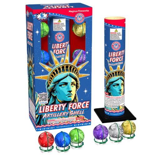 "LIBERTY FORCE": 6 shots of high-octane American pride! This artillery kit features a professional mix of Willows, Brocades, Crackle, and Strobes in a strictly Red, White, and Blue color scheme. Big breaks, patriotic colors, and premium performance. Show your force!