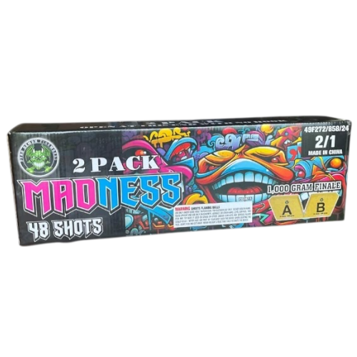 "Madness": 1,000 grams of pure chaos! Red and gold tails and mines launch colossal brocade breaks with a dizzying strobe effect. The ultimate finale!