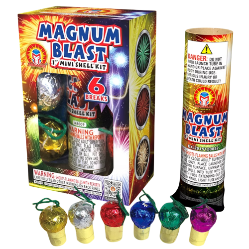 "MAGNUM BLAST": 6 shots of pure artillery action! These 1" ball shells feature high-rising tails and spinners that lead to massive red and green palms. Finished with a thunderous crackle, it’s the ultimate kit for rapid-fire backyard fun. Small shells, magnum power!