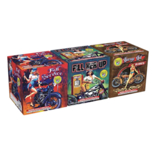 Get the Mechanic Pack where you will get a "Full Service" while we "Fill Her Up" by a "Garage Gal" .A great show starter 3 pack of 200 gram cakes. Awesome effects with finales.
