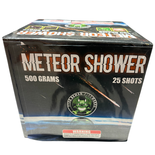 "METEOR SHOWER": 500 grams of high-velocity action! Features whistle and twister tails to brocade crowns with green, blue, and white strobes. This multi-effect masterpiece includes cyan and yellow stars within gold chrysanthemums, ending with a massive brocade-on-brocade volley and a silver chrysanthemum sky-filler.