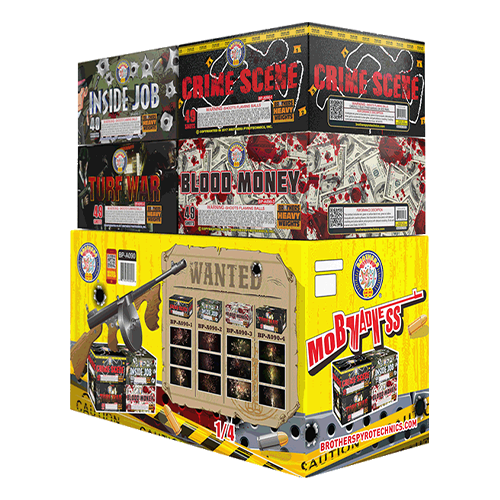 Mob Madness 4-Pack 500g Firework Assortment – 196 Shots Total Own the night with Mob Madness! This 4-pack of 49-shot 500g cakes features a high-velocity mix of effects including whistling tails, swirling dragon tails, and delayed crackle. Includes "Crime Scene," "Inside Job," "Blood Money," and "Turf War." A professional-grade, rapid-fire display with massive 14-shot finales and diverse color palettes. The ultimate high-volume firework case.