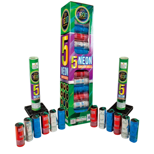 "NEON": 12 shots of 5-inch canister brilliance! Experience the brightest peonies in the business with a full 7-color neon lineup: Red, Green, Blue, Orange, Pink, Yellow, and Purple. Every shot is finished with a flickering strobe for maximum sparkle. Massive volume, massive color, and a total sky takeover. Plug into the power of NEON!