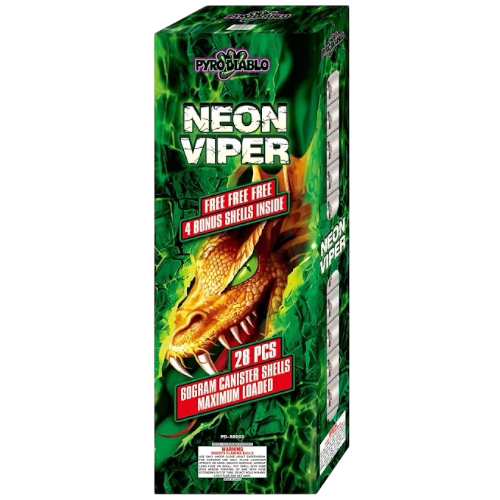 Neon Viper 28-Pack 4" Canister Shells – Multi-Effect 60g Artillery Strike the sky with Neon Viper! This 28-pack of 4-inch 60g canister shells features a pro-mix of dahlias, brocades, chrysanthemums, crackle, strobes, and willows. High-saturation neon colors in red, green, blue, and yellow.