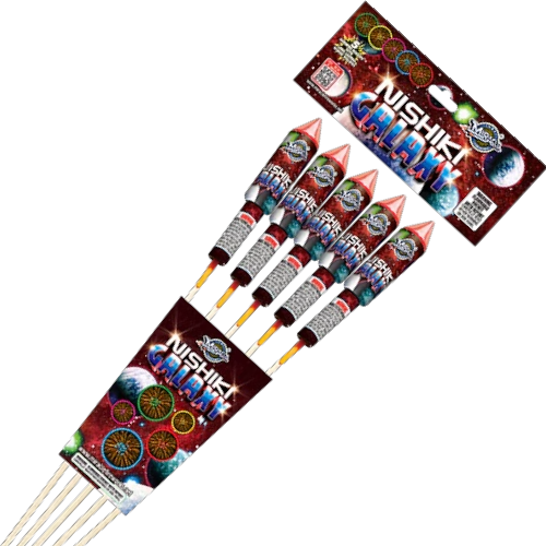 Nishiki Galaxy 5-Pack Rockets – Long-Hanging Japanese Gold Willow Explore the cosmos with Nishiki Galaxy! This 5-rocket specialty kit features long-lasting Nishiki willows with assorted color pistils. High-altitude performance and elite "hang-time" effects.