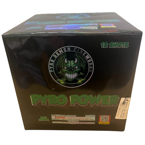 "Pyro Power": 500 grams of pure force! Red, green, purple, gold, and white tails explode into palms, brocades, and strobes.