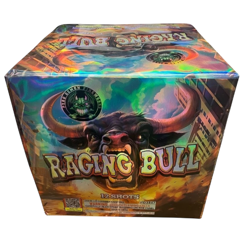 "Raging Bull": 500 grams of untamed power! Brocades, chrysanthemums, strobes, and crackle in a furious burst of red, blue, white, and gold.