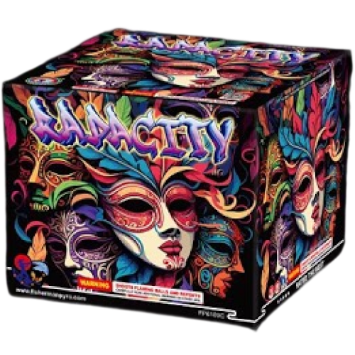 "Rapa City": 500 grams of relentless power! Featuring a sophisticated mix of red brocade, sky blue stars, and flickering white strobes. This cake utilizes chrysanthemum mines for ground-to-air coverage and finishes with an aggressive white strobe ejection and red chrysanthemum finale. Welcome to the city!