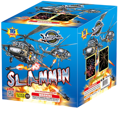 Slammin' 16-Shot 500g Firework Cake – Pigeon Blood Red & White Strobe Get high-intensity color with Slammin'! This 16-shot 500g "Big Bore" aerial cake features gold tails to deep pigeon blood red dahlias and super white strobe. High-contrast patriotic effects with a massive 4-shot finale. Professional-grade saturation and maximum powder per tube for the largest break diameters. The ultimate high-impact red and white display.