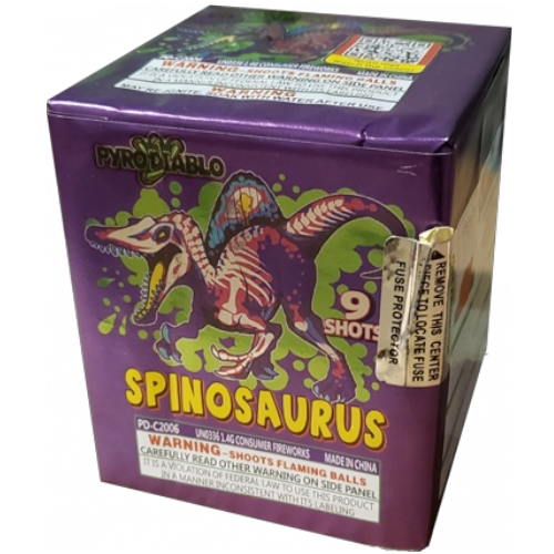 "SPINOSAURUS": 9 shots of golden glory! Featuring a triple-threat rotation of Brocade Crowns to Golden Willows with Red, White Strobe, and Blue accents. It’s a 200-gram cake that performs like a heavyweight, delivering long-hanging gold threads and crisp color breaks. Rule the backyard with the king of the willows!