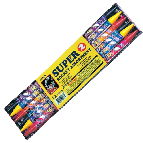 Super 2 Rocket Assortment 12-Pack – Multi-Effect Rocket Kit Take to the skies with the Super 2 Rocket Assortment! This 12-rocket kit features two of each classic effect: multi-color, red, green, crackling, thousand bees, and white strobe. High-altitude performance and high-visibility colors.