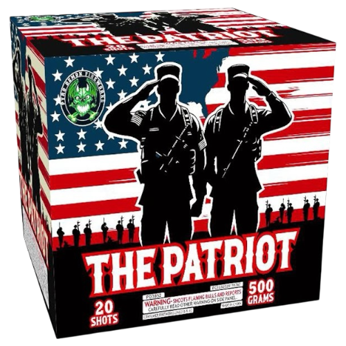 The Patriot 20-Shot 500g Firework Cake – Patriotic Palms & Comets Salute the stars and stripes with The Patriot! This 20-shot 500g aerial cake features fiery tails and brilliant comets leading to massive golden palms and spreading chrysanthemums. Accented with red, blue, and gold stars, dazzling strobes, and powerful crackle. A high-altitude, multi-layered patriotic display with professional-grade sky saturation.