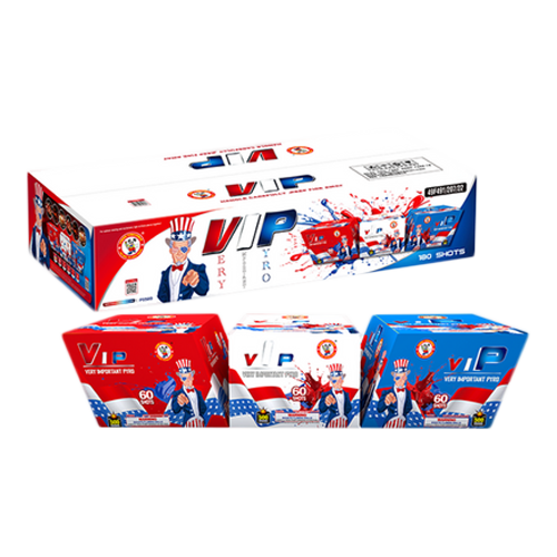 Fire up this 3-piece VIP set together for non-stop, intense fan action accented by brocade tails to massive flower crown with red/blue tails. 180-shot showstopper!