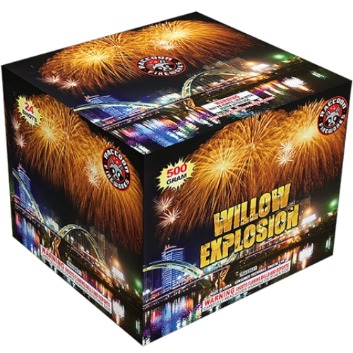 Willow Explosion 24-Shot 500g Firework – Fast-Paced Gold & Blue Fill the night with Willow Explosion! This 24-shot 500g aerial cake delivers a high-velocity display of massive golden willows and deep blue stars. Features rapid-fire cadence and professional-grade sky saturation. Maximum "hang time" meets high-speed performance for a continuous golden canopy. The ultimate high-energy willow firework for 2026.