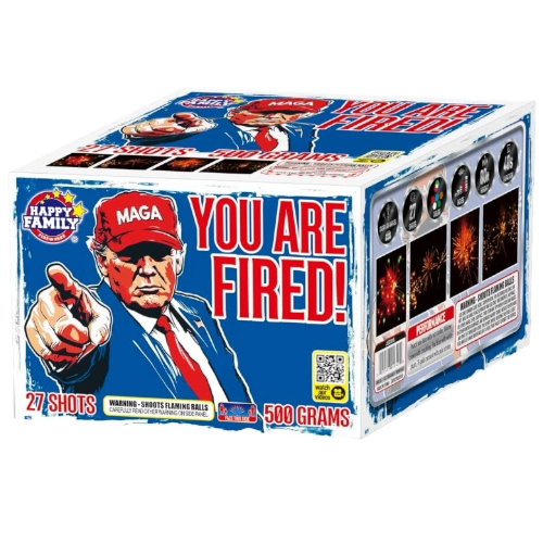 You Are Fired 27-Shot 500g Firework Cake – Ti-Gold Coconut & Red Plum Take charge of the night with You Are Fired! This 27-shot 500g aerial cake features red and blue stars with strobes, willow crowns with crackle, and the rare red plum effect. Concludes with massive Titanium Gold Coconuts and gold strobes. A high-energy, professional-grade 500-gram display with a thunderous finish.